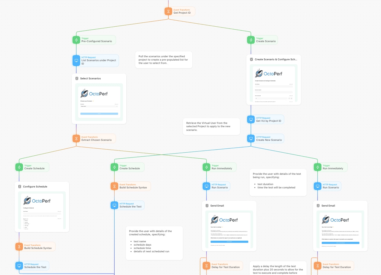 Tines’s versatility comes from its ability to integrate with any tool that offers an API. By combining Tines with the OctoPerf platform, Tines provides a streamlined way of automating the creation, scheduling, and execution of test scenarios and delivering the final analysis reports right to your inbox. In this blog, we will cover a story that does exactly that.