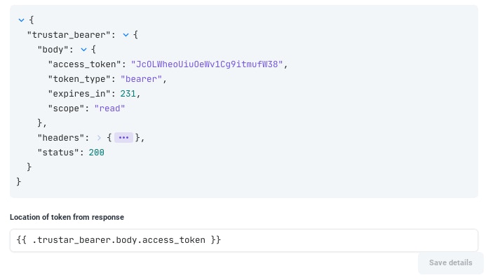 We've created an HRAC that will request a token from TruStar when we give it some authentication parameters. Using "Run Options", the HTTP request above will be made and then results will be shown. Then we can identify where the authentication token is in the "Location of token from response" field, referencing fields of the response like on the Tines Storyboard.