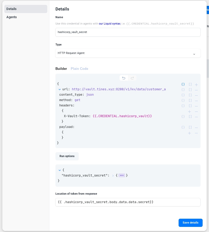 We'll again create a basic text credential with the token we need to access the vault. Then, we'll create an HRAC to access HashiCorp Vault to get a secret stored there in its key/value storage. In this example, we'll get the secrets for a single customer named "customer_a":