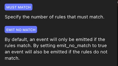 There is also an option to “emit no match” which will emit an event if no match is found against the rules within a trigger. This keeps the story flowing downstream if you want to determine if a certain value fits a rule, but you don't want a separate branch, nor do you want the story to stop.