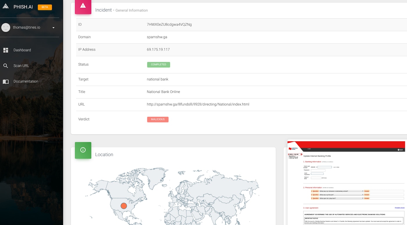 Analysts can also use the phish.ai dashboard to view more information about the detection or a screenshot of the phishing page.