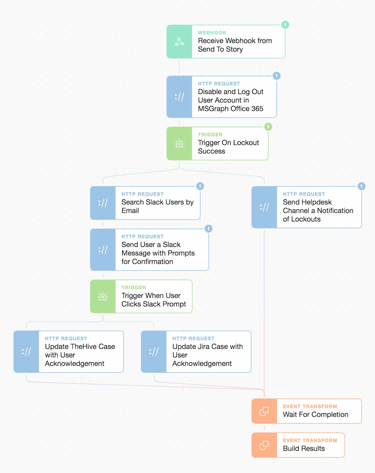 Now that we have locked the primary account, informed the user, they have responded, both cases have been updated, and the Helpdesk team has been informed... we finalize the Story workflow - but only once these events have come through to the "Wait For Completion" Event Transformation implode Action.