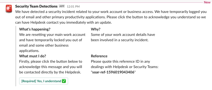 Note: This is part 3 of a 3 part series on security automation for dealing with account compromise. Part 1 covers detection, part 2 looks at enrichment and case management, while part 3 tackles protection and response including prompting the user to acknowledge the incident via a side-channel.