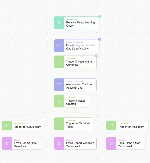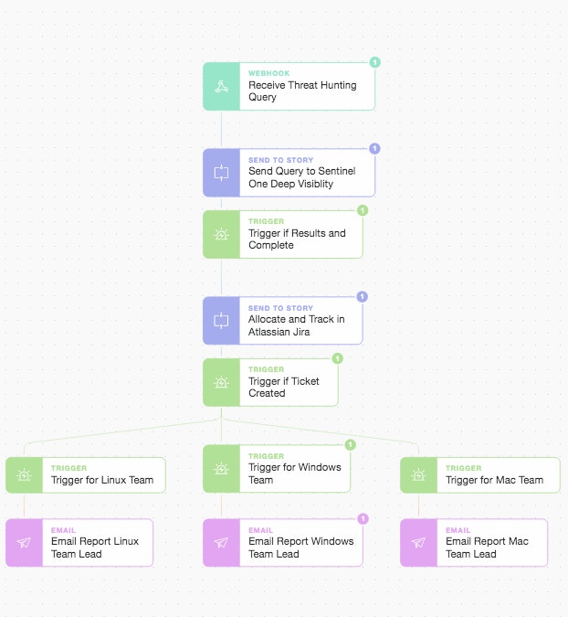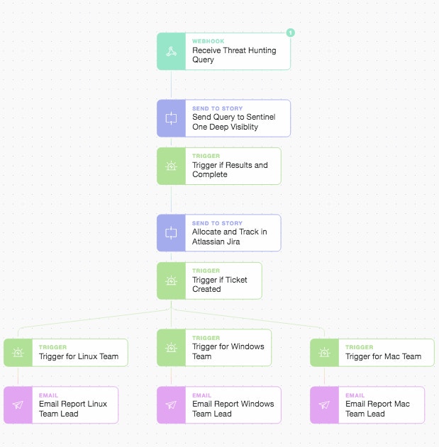 We will construct a simple threat hunting query looking for an IoC (Indicator of Compromise) and issue it to our main Story via a webhook Action. This means the main Story itself becomes modular as you can initiate the workflow from a range of initial sources. We will ask SentinelOne’s Deep Visibility platform to search for events across a specific window of time, looking at our installed Windows fleet to try and find any host or process that made DNS requests to the domain “www.iuqerfsodp9ifjaposdfjhgosurijfaewrwergwea.com”. This domain is a high confidence IoC due to its use as a Command and Control (C&C) host for ransomware. We could just as easily look for a SHA256 file hash or destination IP addresses. If we get back any results we format them and move on to quickly raise a Jira Service Desk ticket. This is to ensure remediation is tracked and completed while we also email the responsible team leads (or department heads).