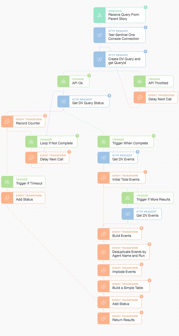 If we dive into the first part of the Story i.e. the SentinelOne Deep Visibility sub-story, we can unwrap how to deal with everything from a background search job (via API) to different vendors pagination approaches by using only a few more automation “verbs”. Let’s take a look at how our first sub-story unfolds: