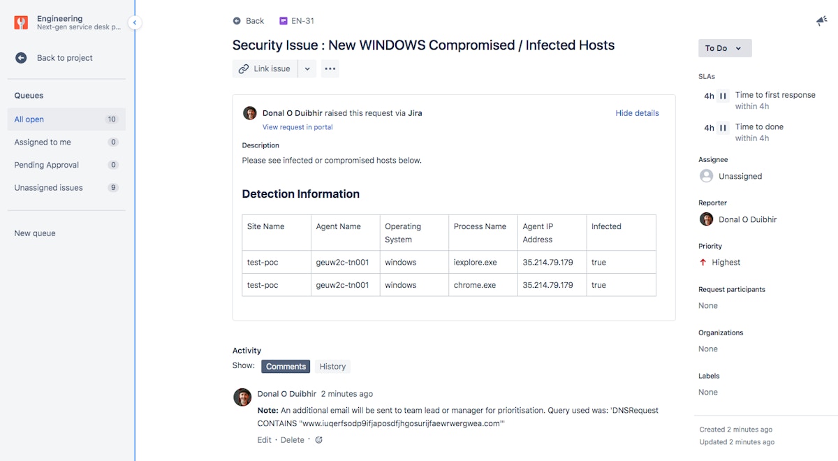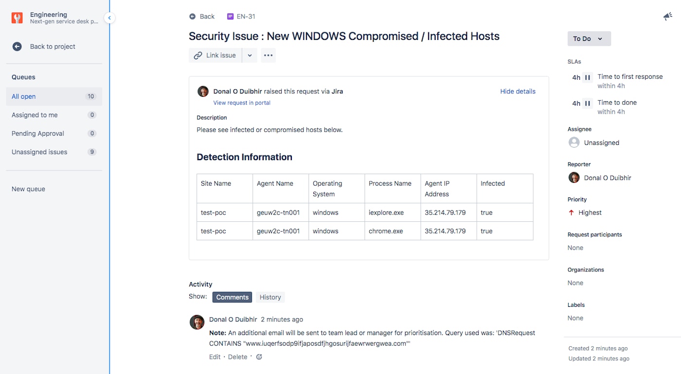 The above sub-story results in the populated ticket below. We can embellish this sub-story over time to use additional Tines widgets to prompt for manual authorizations to spark further automation workflows. As we’re dealing with servers, we require more information before arbitrarily quarantining a host or blocking primary processes (but it’s obvious we already have a problem when someone or something is using browsers on servers to access malicious domains!).