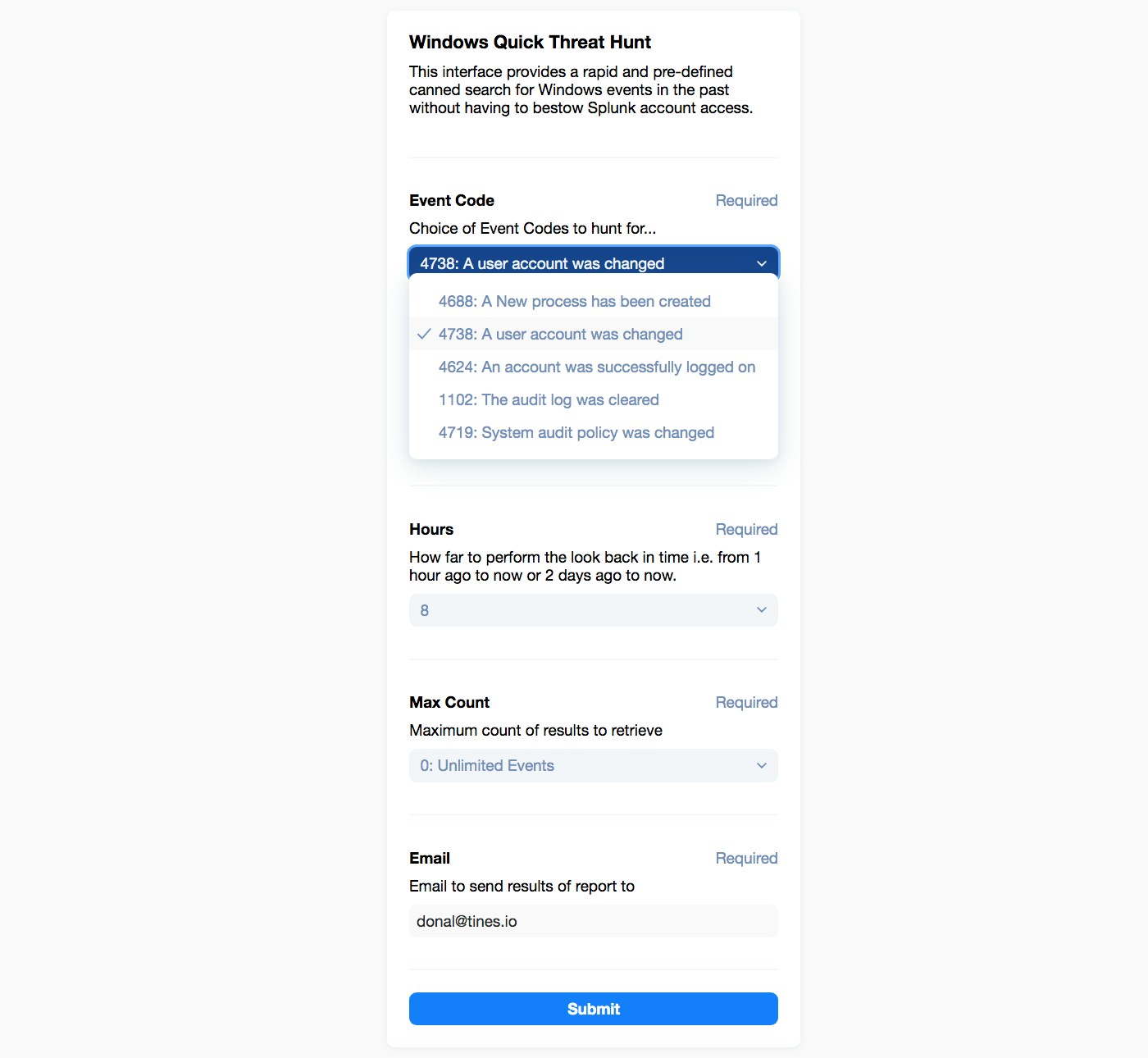 Privileges: -But what if we could automate these steps (and include polling and error-checking logic)? Perhaps we could add some more useful Windows Event Codes to check for evidence of miscreants and broader foul play? Maybe we could provide a simple form to produce a canned report that would also email back to the requester with a CSV file containing the results?