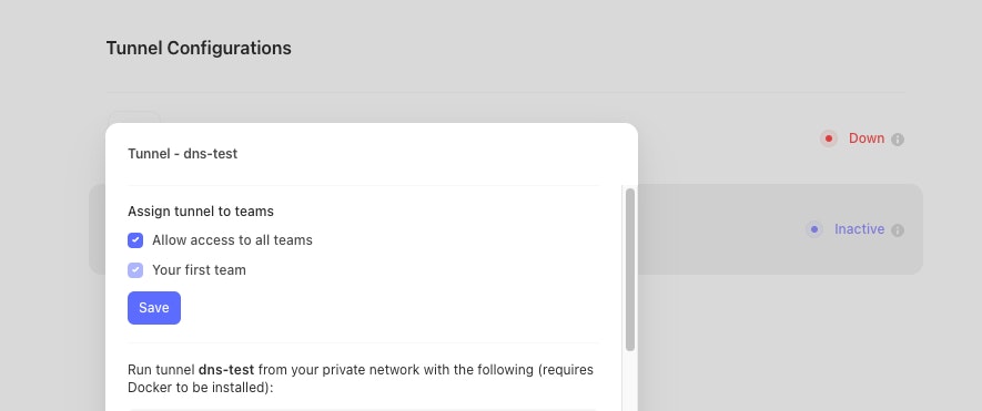 Tenant owners or users with the TUNNEL_MANAGE tenant permission can restrict which team(s) can use a tunnel from the link https://<tenant-domain>/admin/tunnel. The default for all existing and new tunnels is that any team can access them until an admin chooses otherwise.