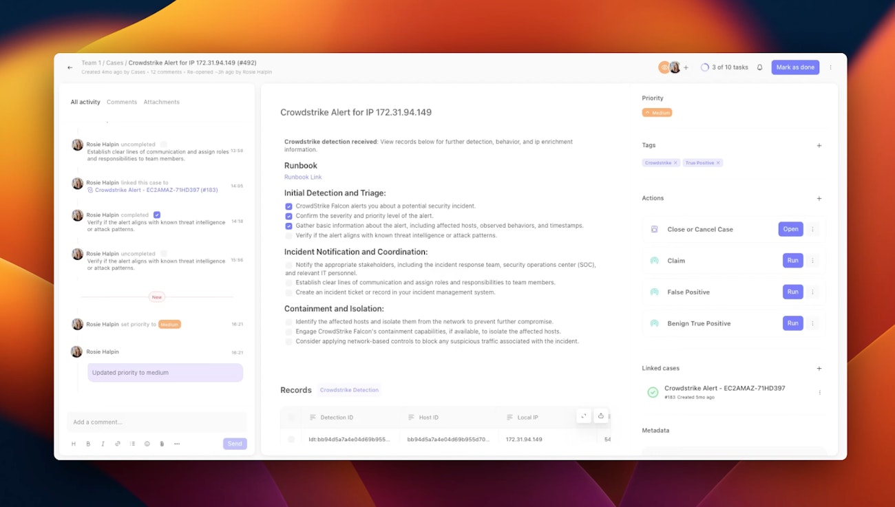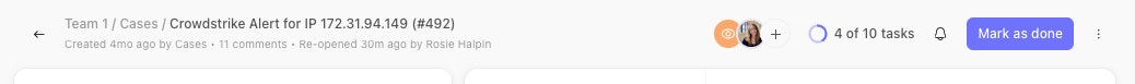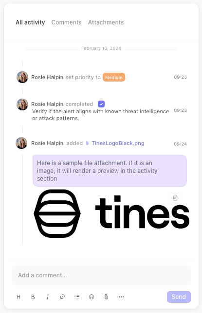 Collaborators can also add comments or upload files to the case activity section. Images uploaded are automatically rendered as a preview within the activity section. Users can filter for a specific type of activity by selecting Comments or Attachments. Comments support markdown for custom formatting, and can be can be captured via API as well to document custom activity not included in the list above such as confirmation of custom actions taken. Users can also react to comments with a specified set of emojis: 👍 👎 👀 ❤️ ✅. Files can also be attached via the API.