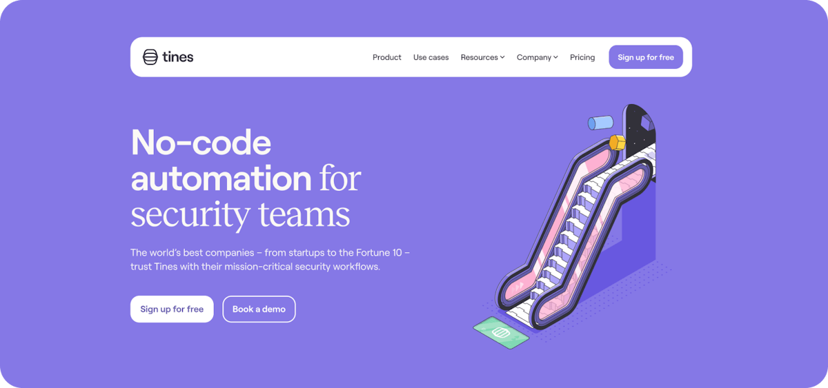 Here on the site itself, we aim to be clear and plainspoken when it comes to explaining Tines. Hence our to-the-point headline, No-code automation for security teams, and how we share that our customers automate an average of 20 workflows in their first year.