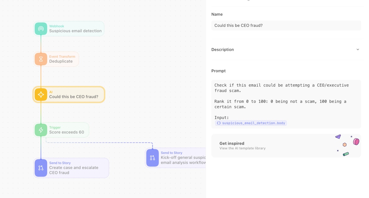 A simplified version of a suspicious email analysis workflow using the AI action