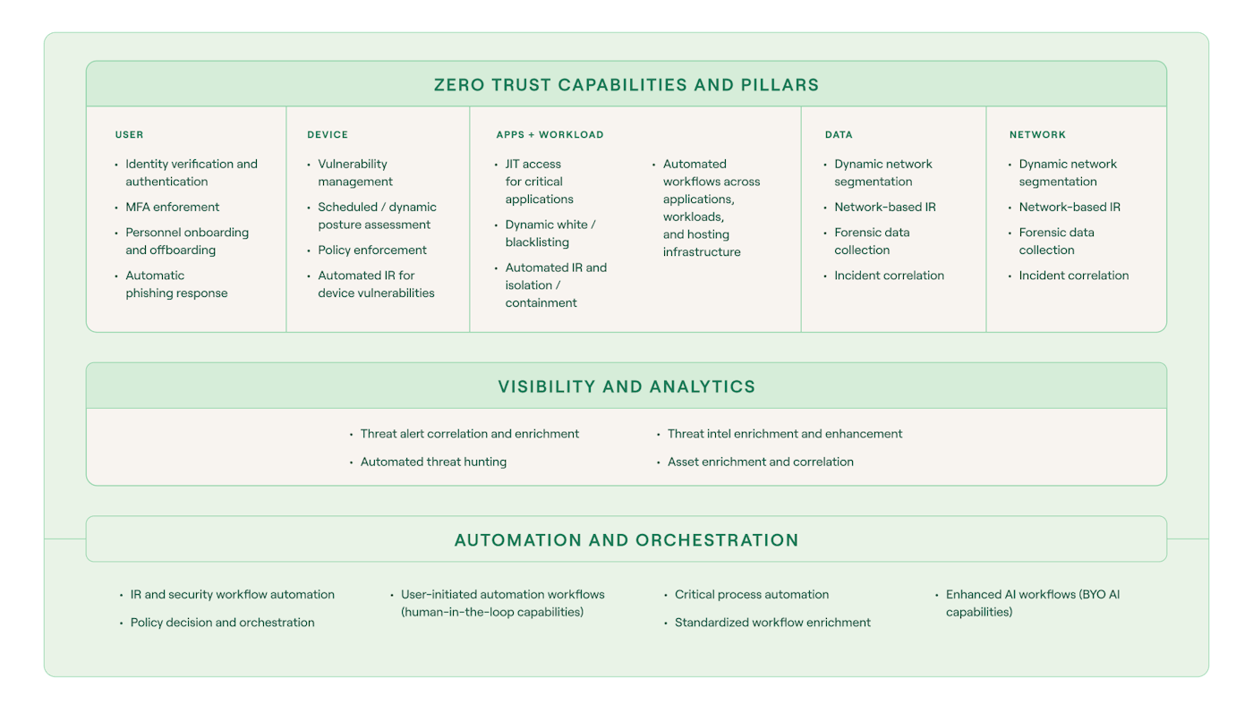 The right-fit platform will be the connective tissue of your zero trust architecture, creating a unified defense strategy by extracting data from disparate tools across the entire organization and orchestrating responses to potential threats.