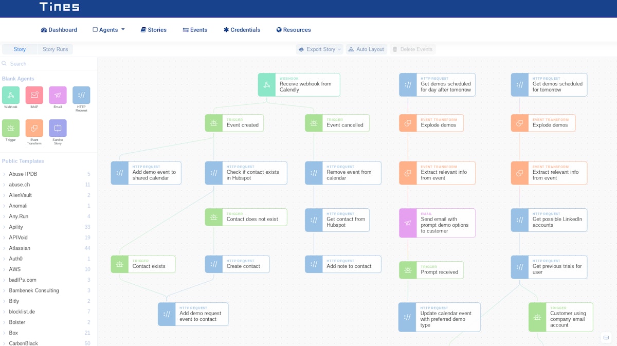Depending on the event type from Calendly, Tines creates or removes an appointment on a shared calendar where we track customer demos. In addition, Tines updates our CMS, Hubspot, with the customer’s details.