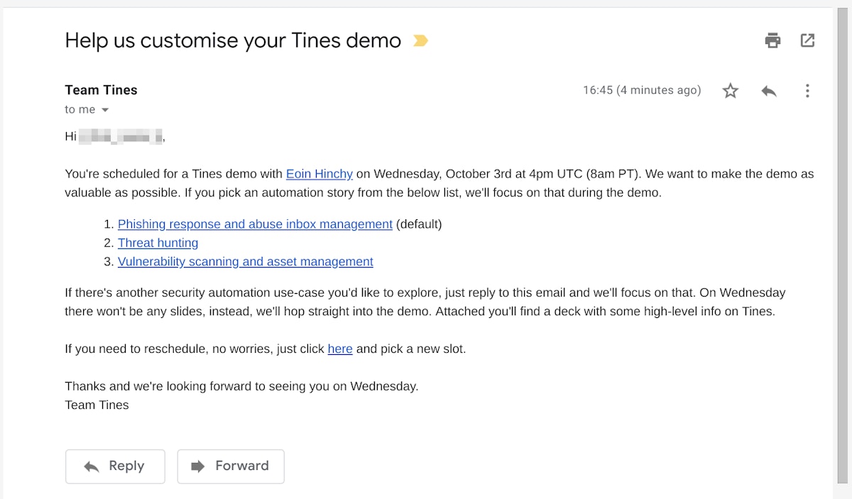 Sample of Tines email sent to employee in advance of demo