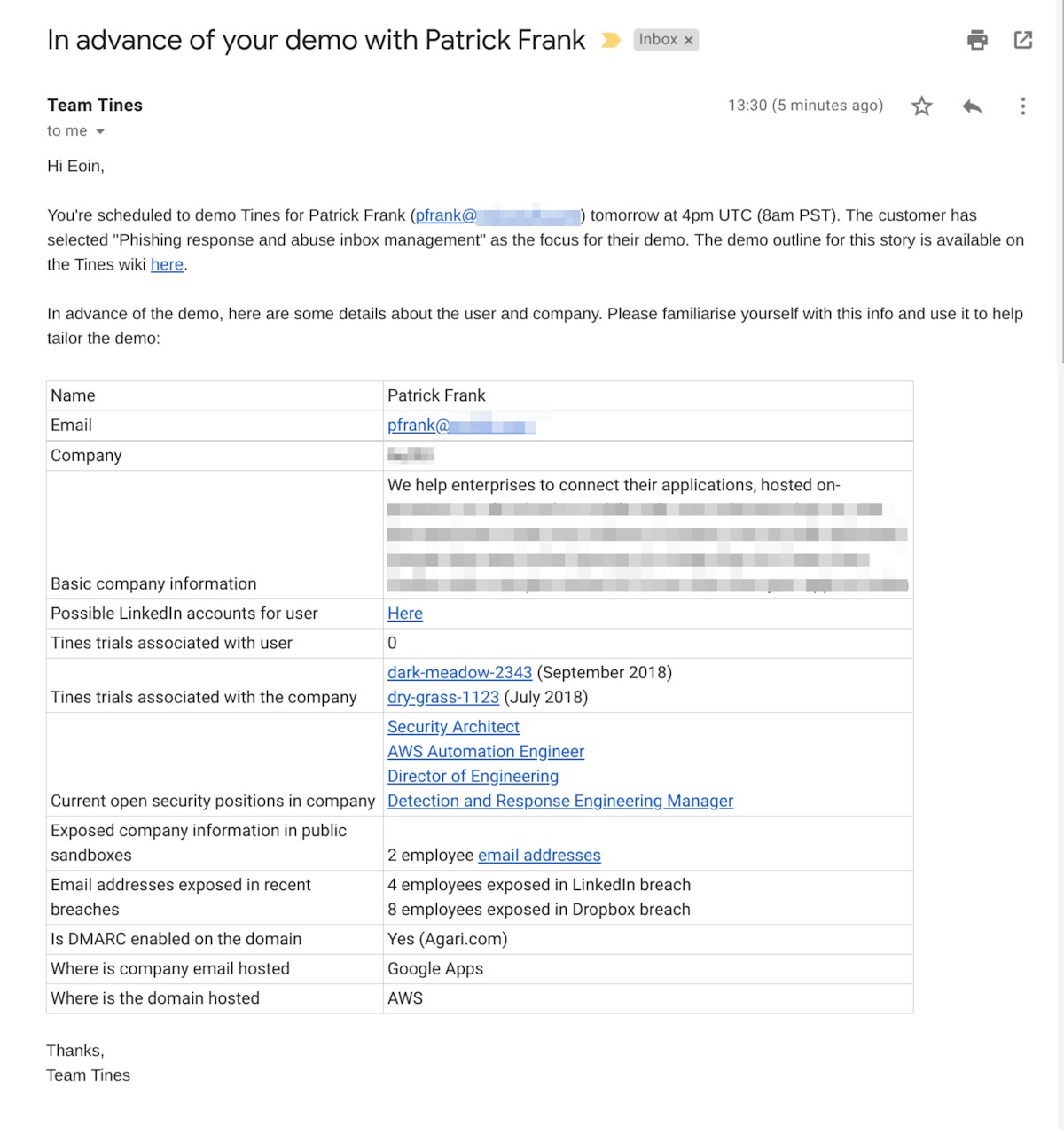 By including a link to the Tines employee’s LinkedIn profile and a slide deck describing Tines, its core features, and differentiation points, nine times out of ten we can skip the long intros and jump straight into the most valuable part: the product demo.