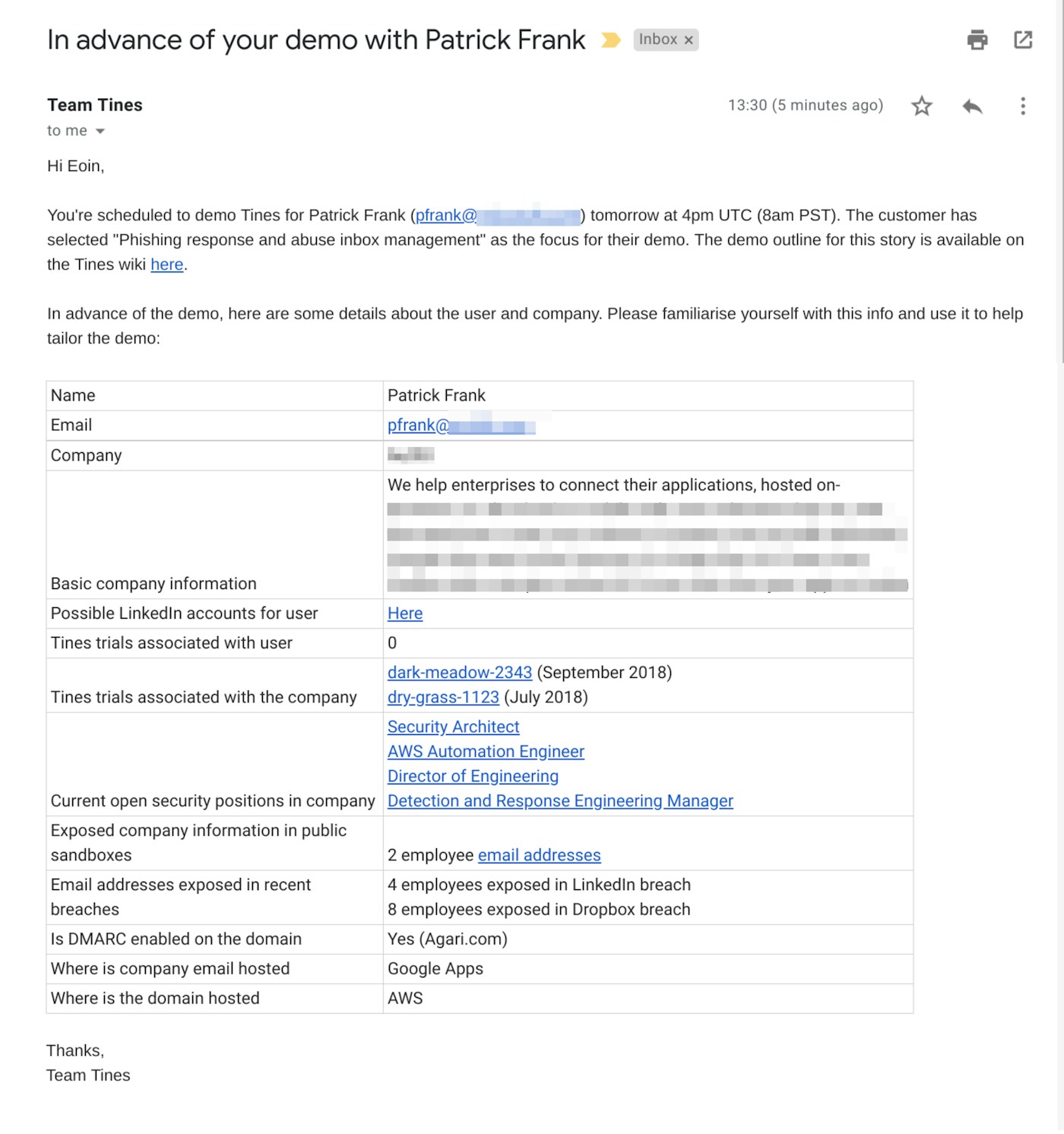 The end result is that 24 hours before the customer demo, the Tines employee scheduled to provide the demo will receive an email similar to that shown below: