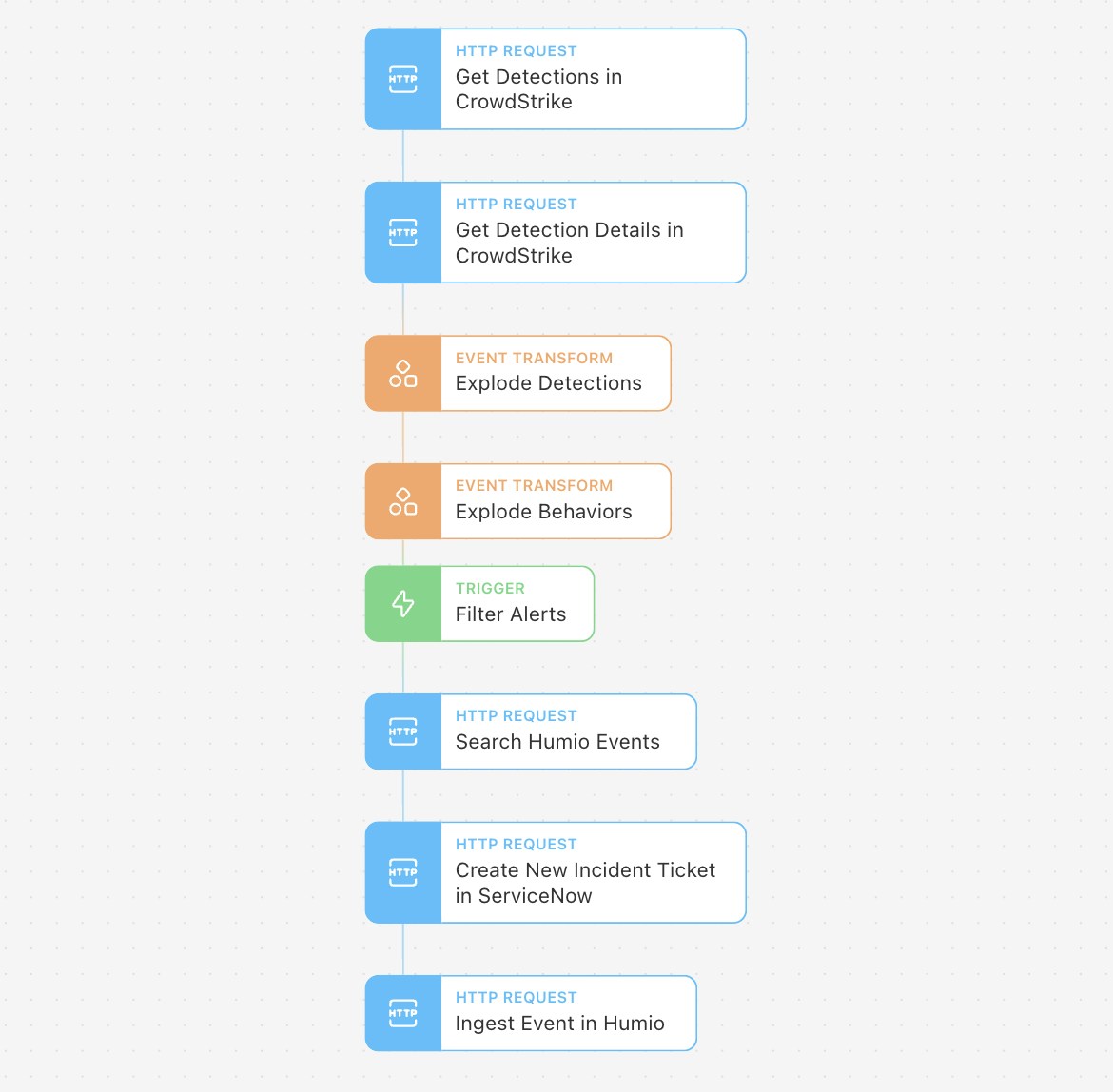 With a Trigger Action, we filter out false positives and any events that don't match our criteria before performing additional enrichment and searching Humio to check if the alert has occurred before. In this particular workflow, Tines automatically opens an incident in ServiceNow for someone to review it. Finally, Tines sends the alert to Humio to be stored, so it's easily searchable if it happens again in the future.