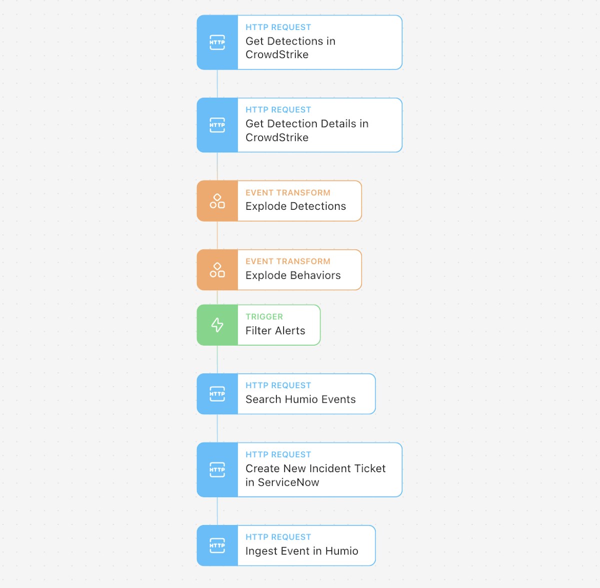 With a Trigger Action, we filter out false positives and any events that don't match our criteria before performing additional enrichment and searching Humio to check if the alert has occurred before. In this particular workflow, Tines automatically opens an incident in ServiceNow for someone to review it. Finally, Tines sends the alert to Humio to be stored, so it's easily searchable if it happens again in the future.