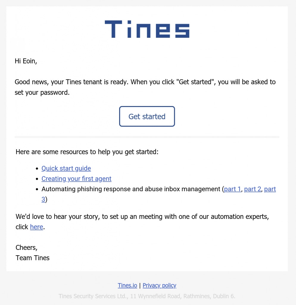 Additionally, if something goes wrong, for example, there are no trial-pending droplets available, Tines support are notified using an Email Action.