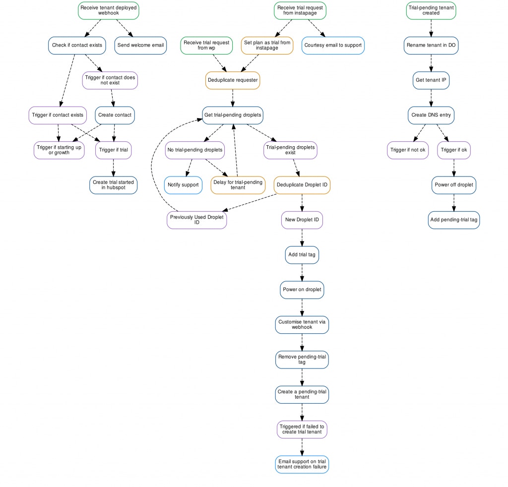 To speed up the provisioning of Community Edition tenants, Tines maintains a pool of pre-configured droplets labeled “trial-pending”. When a trial is requested (middle flow in the above diagram), Tines receives the request via a Webhook Action. After deduplicating the request, Tines takes a trial-pending droplet from the pool and begins to configure it based on the requesting user’s details (we use a simple deployment script for this). When no trial-pending droplets are available, an Event Transformation Action delays the flow while a droplet is built.