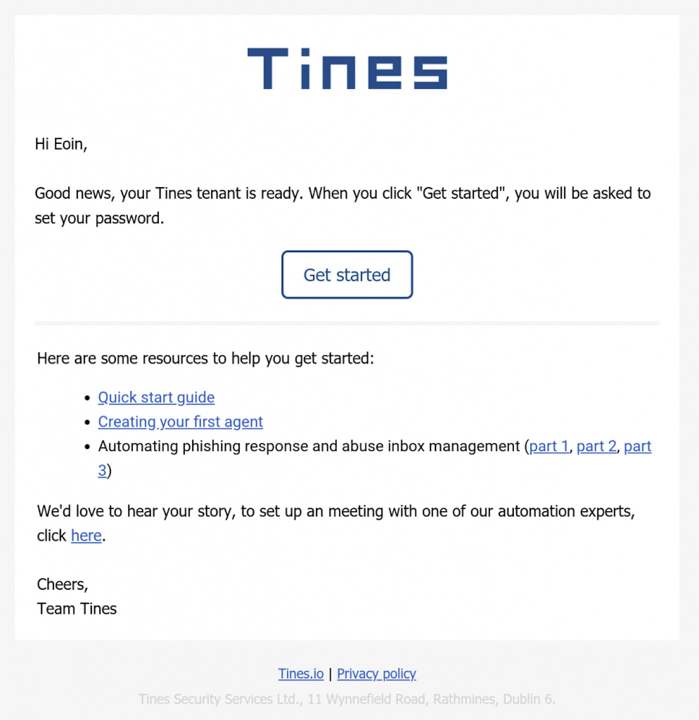 Additionally, if something goes wrong, for example, there are no trial-pending droplets available, Tines support are notified using an Email Action.