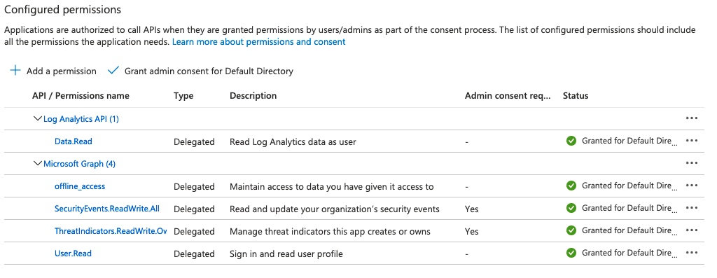 • Microsoft Graph's ThreatIndicators.ReadWrite.OwnedBy - used for creating threat indicators in Azure Sentinel.