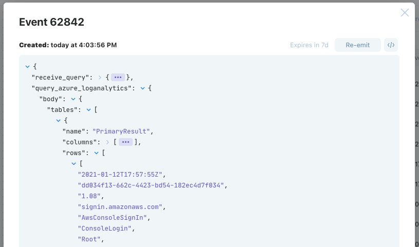 When the "Query Azure Log Analytics" Action is executed with the query, we can look in the Action events to see what data we got back!