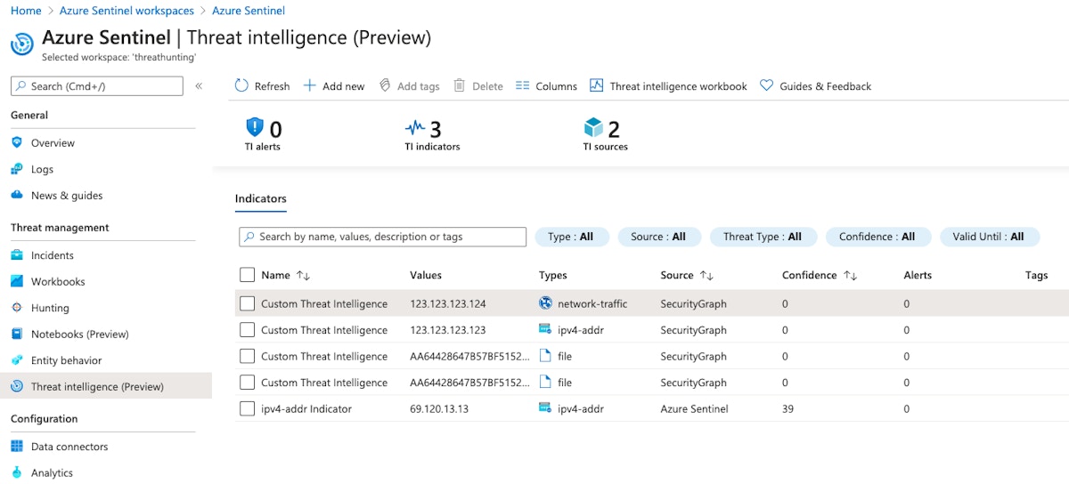 The new indicators will appear in the "Threat Intelligence (Preview)" panel of Azure Sentinel and can be correlated against all data sources being brought into Azure Sentinel.