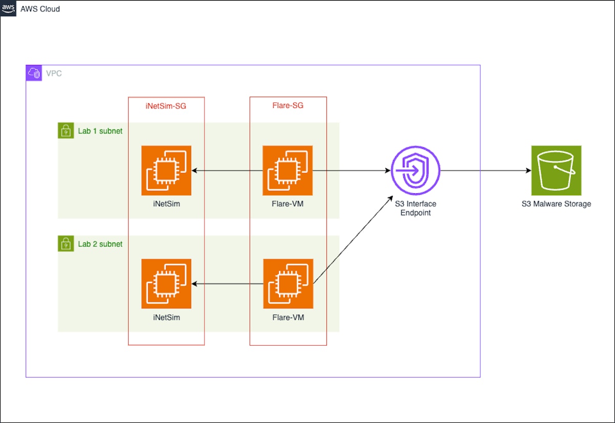 This AWS lab environment consists of multiple subnets in an isolated VPC. Each subnet is a separate malware lab. These malware labs have 2 EC2 instances, Flare-VM by Mandiant and INetSim. Flare-VM is a collection of software installation scripts that provides many malware analysis tools for Windows. INetSim’s network emulation assists in providing fake network responses to potential malware, helping disguise the isolated nature of the environment. Malware can use the lack of network connectivity to detect if it’s in a sandbox environment, allowing it to hide its malicious components.
