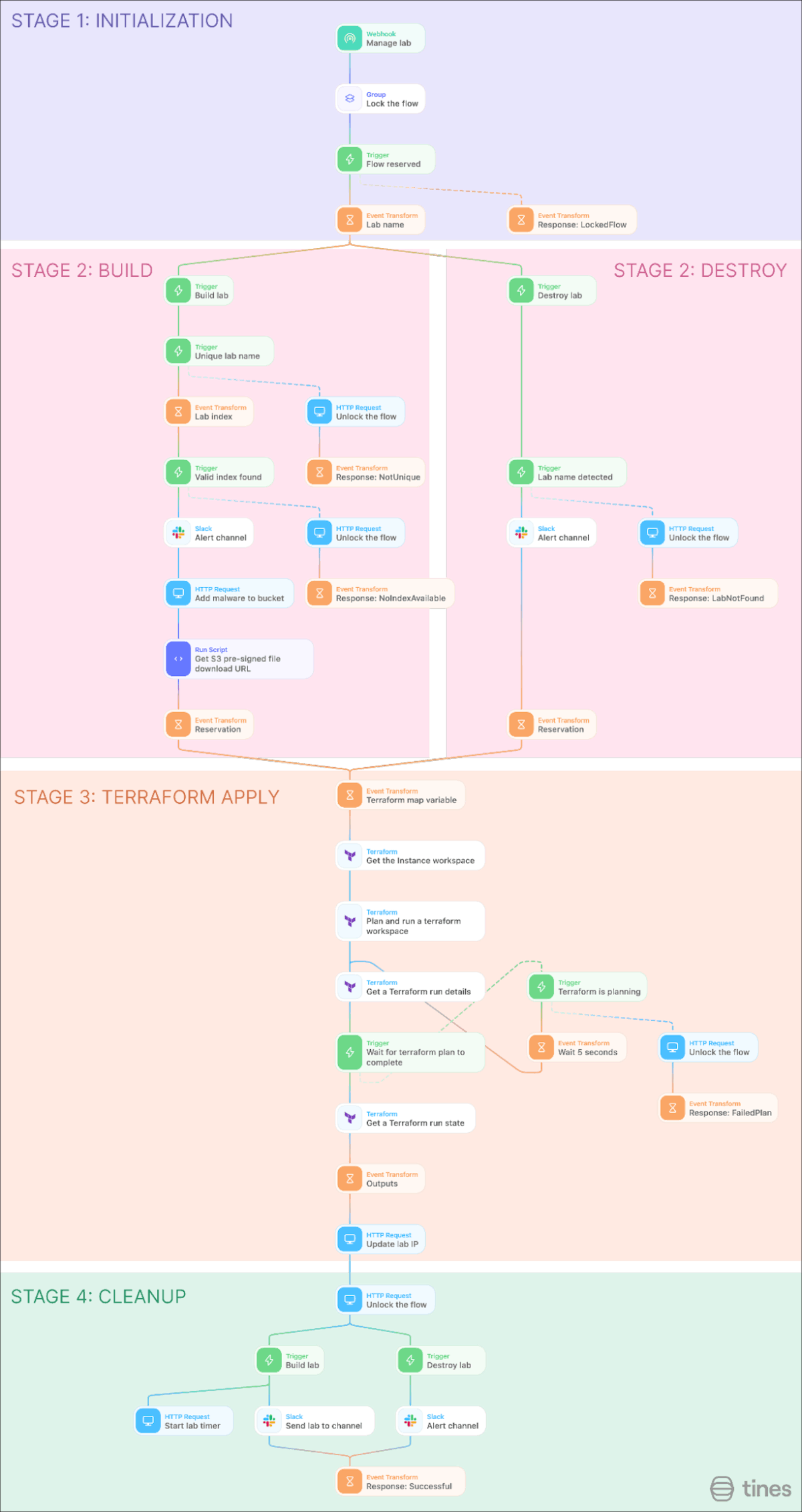 Since we have Terraform managing the lab infrastructure, Tines can be used to orchestrate between Terraform and various other tools that might be used to start one of these labs. To start this orchestration, we need to use automation to build and destroy labs in Terraform.