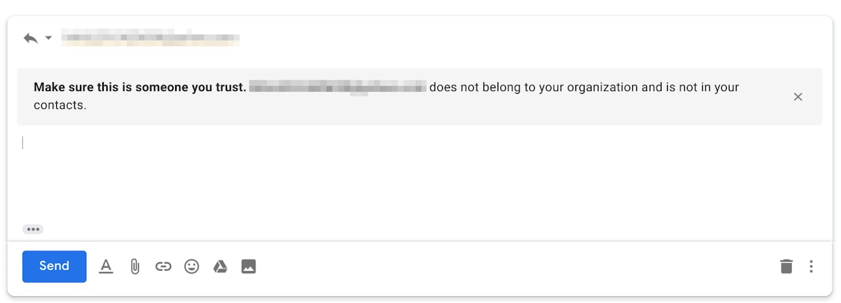 As the CEO fraud email will likely originate from outside your organization, displaying a warning to the recipient indicating the message is from an external source may be helpful. However, if the target receives many external emails, it’s likely they will habituate or “tune out” security warnings like the below.