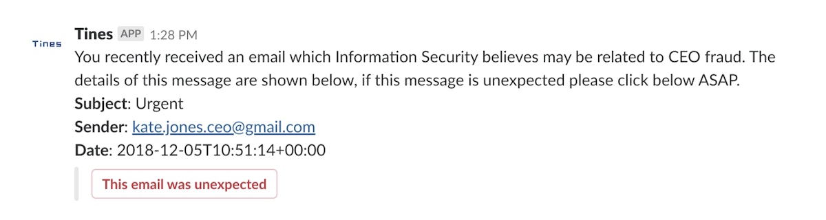 Now, when one of our users receives a potential CEO fraud email, seconds later, they will receive a Slack message similar to the following: