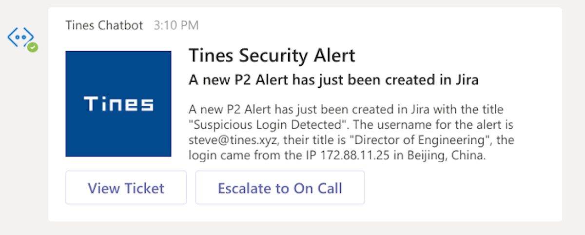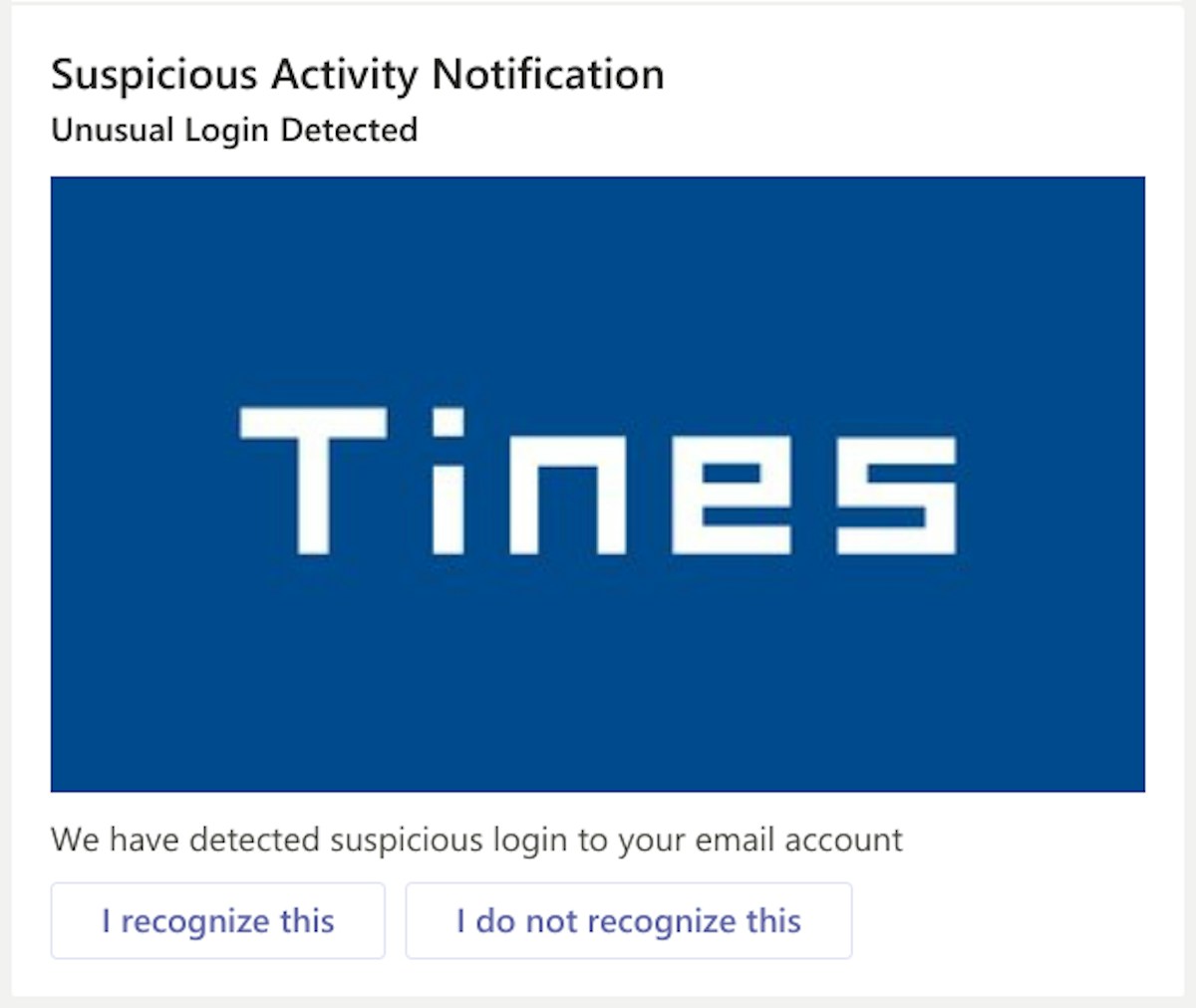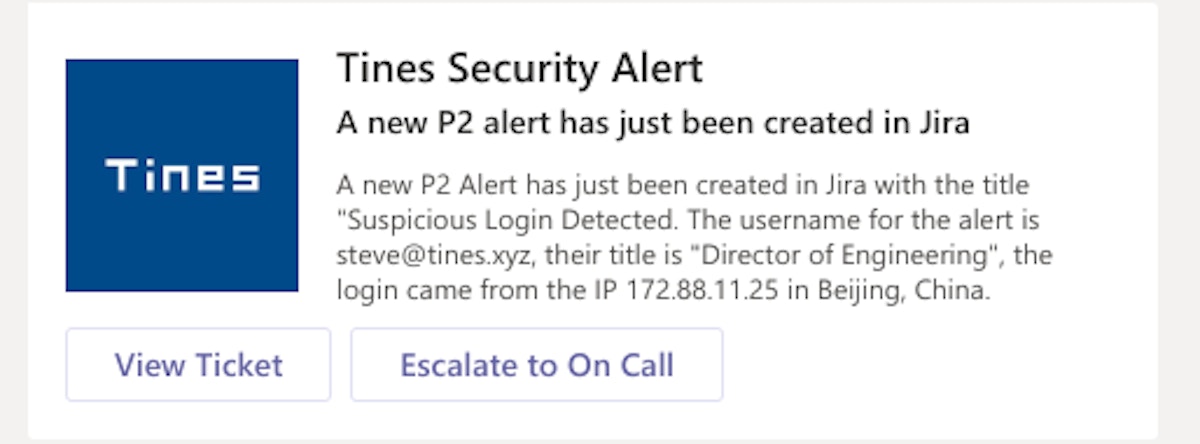 }The last step is to send a notification to the user – this can be done very easily using templates from any of the cards above. You can include a prompt that will automatically take the next step – e.g. escalating to on-call, closing an incident, or locking an account. The prompt can also force a second-factor confirmation through Tines using a tool like DUO or Okta.
