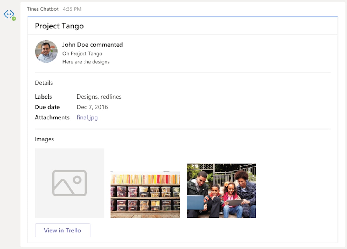 You can make cards as complicated or rich as you deem necessary, for example using a card like below. These cards are all available as templates within Tines.
