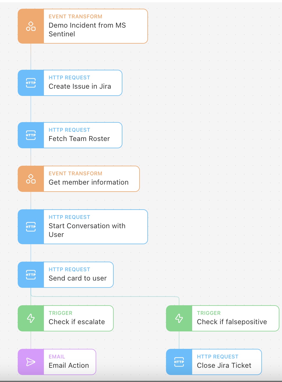 The steps above successfully use the Microsoft APIs to fetch the team, identify a user, and send a card to a user. The Story in this post shows integrations with a Microsoft Sentinel alert and Jira. In reality, we could use any SIEM or other alerting mechanism to ingest information and kick off the flow. Additionally, case management systems can be leveraged to collect information, and third-party tools such as Urlscan or VirusTotal could be easily added to the Story for additional enrichment. Triggers and prompts are used in the Story to conditionally flow the events through unique branches and take conditional actions.