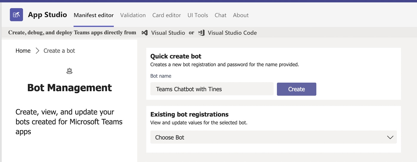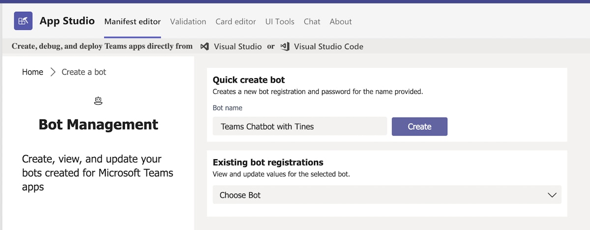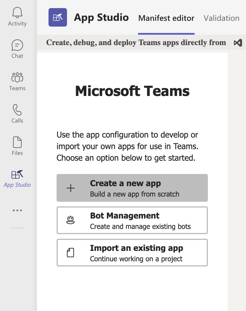 Once App Studio is installed, we will create a new bot within Microsoft Teams. Use the sidebar of Microsoft Teams to navigate to App Studio —> Manifest editor —> click "Bot management."