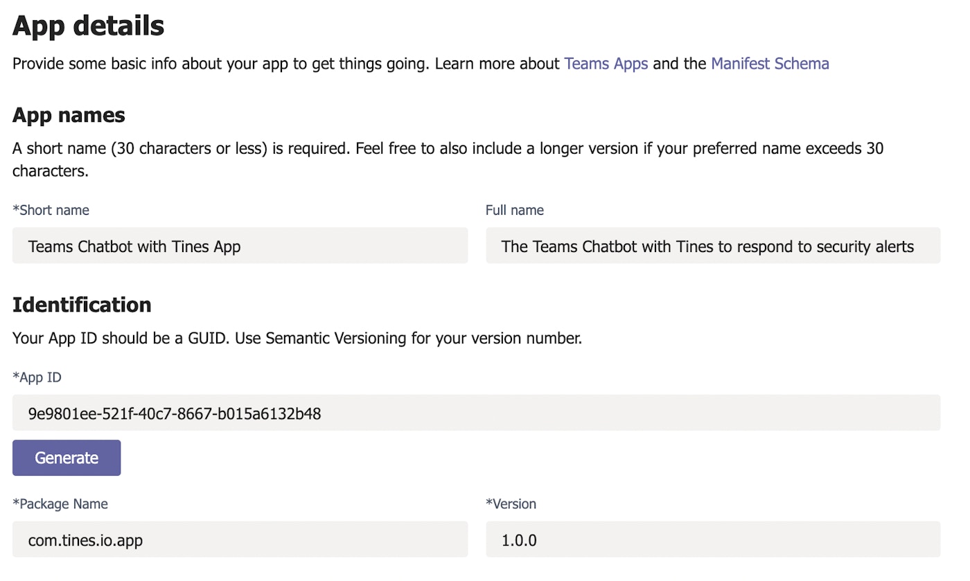 2. Enter a short name, full name, generate an App ID and fill in the Package Name (com.tines.io.app) and Version Number (1.0.0). Note down the App ID somewhere safe for easy future reference.
