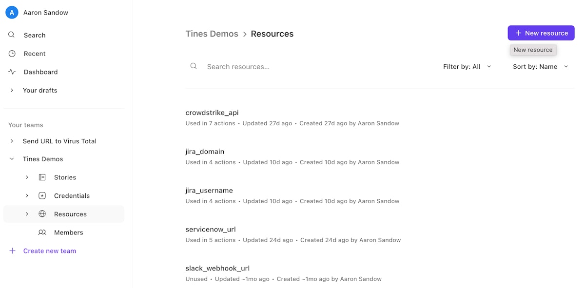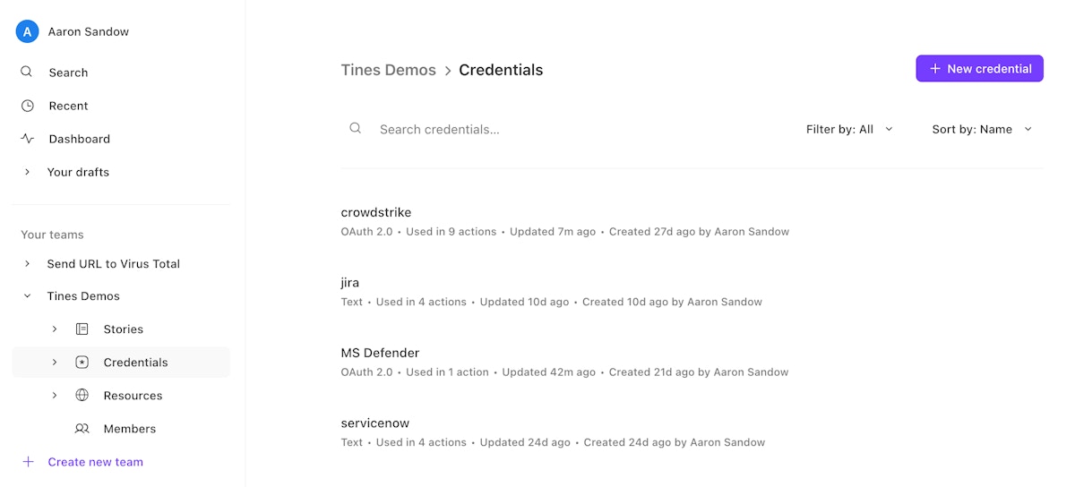Log in to your Tines tenant and either navigate to an existing team or create a new team. Once in the appropriate team, navigate to credentials and click "New credential" on the top right.