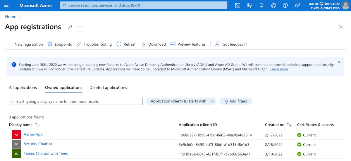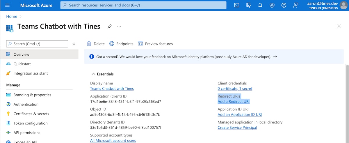 Since those blogs were written, the Tines platform has significantly evolved in many areas. One major enhancement was to our credentials vault. Previously, as suggested in Part 1, authenticating with Microsoft required leveraging HTTP Request Actions within a Tines Story to manually perform the client credentials flow and request a bearer token from Microsoft. Thanks to an update, the client credentials flow can now be handled directly within our credentials vault. This blog will walk through how to set up a chatbot within Microsoft Teams, authenticate the chatbot leveraging the client credentials flow natively from within Tines, and provide a security analyst the ability to respond to an alert via Microsoft Teams.