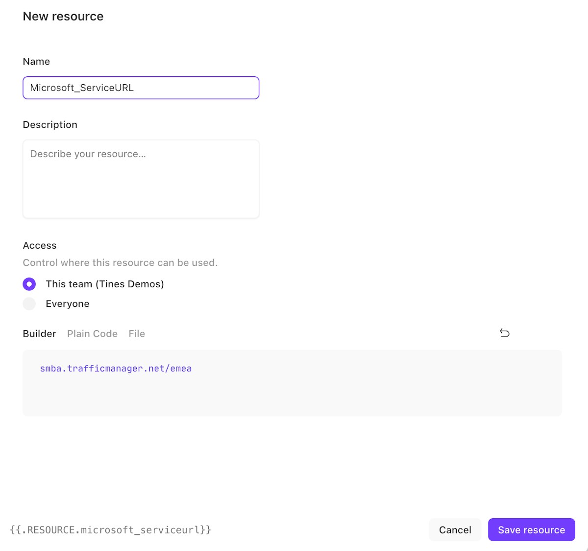 2. Enter in a Name (e.g., Microsoft_ServiceURL is used in the Story attached and can be leveraged for consistency), Description, decide Access for where this resource can be used, and enter the URL into the builder (your specific URL may end with something else like "amer"). Click "Save resource."