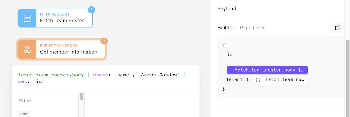 3. Use an Event Transform Action to map the ID and tenantID for the member that you want to send the message to. We will use the results from the Fetch Team Roster Action to associate the correct information. Change the 'where' clause to match the name of the person you’d like to fetch the ID for. The name must match a name on the Team Roster returned from the Action above (Fetch Team Roster).