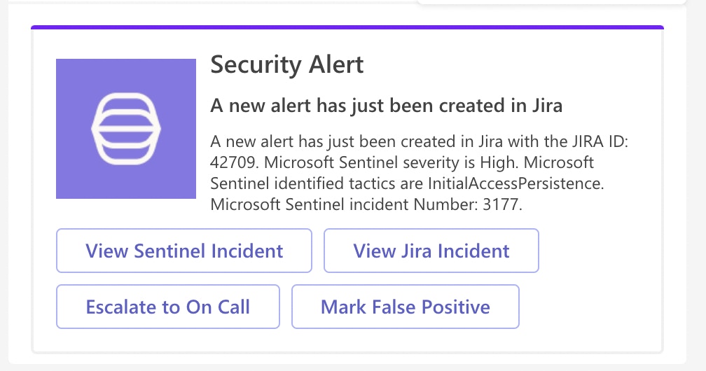 This particular Story, which is available to download and import at the end of this post, leverages an alert from Microsoft Sentinel, but we could use any SIEM or incident source with a publicly accessible API. Tines offers preconfigured Action templates that allow end-users to swiftly connect to many popular tools. After the alert comes into Tines, this Story will create a JIRA ticket. Again, Tines can connect to any case management tool with a publicly accessible API - preconfigured templates are readily available for leading vendors. Once the incident ticket is open, we will alert the proper security analyst on Microsoft Teams and prompt them to take action directly with their chatbot!