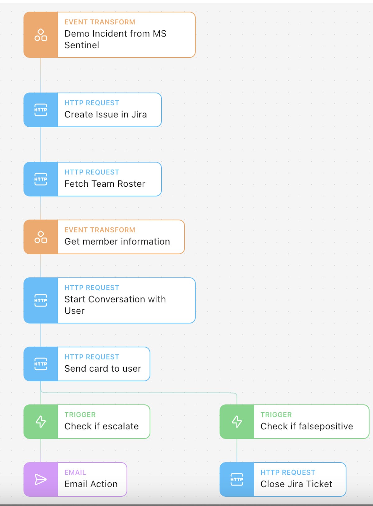 The steps above successfully use the Microsoft APIs to fetch the team, identify a user, and send a card to a user. The Story in this post shows integrations with a Microsoft Sentinel alert and Jira. In reality, we could use any SIEM or other alerting mechanism to ingest information and kick off the flow. Additionally, case management systems can be leveraged to collect information, and third-party tools such as Urlscan or VirusTotal could be easily added to the Story for additional enrichment. Triggers and prompts are used in the Story to conditionally flow the events through unique branches and take conditional actions.