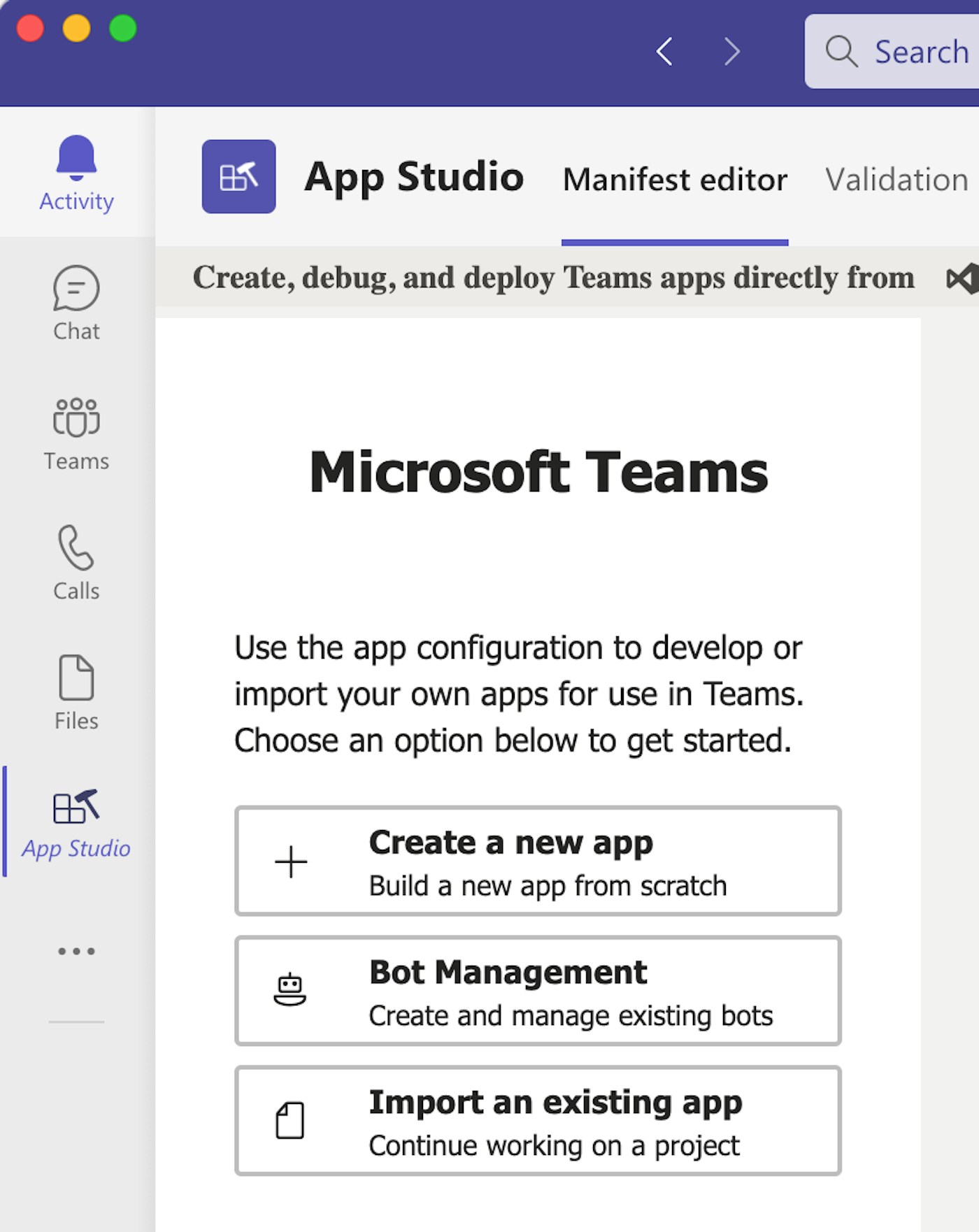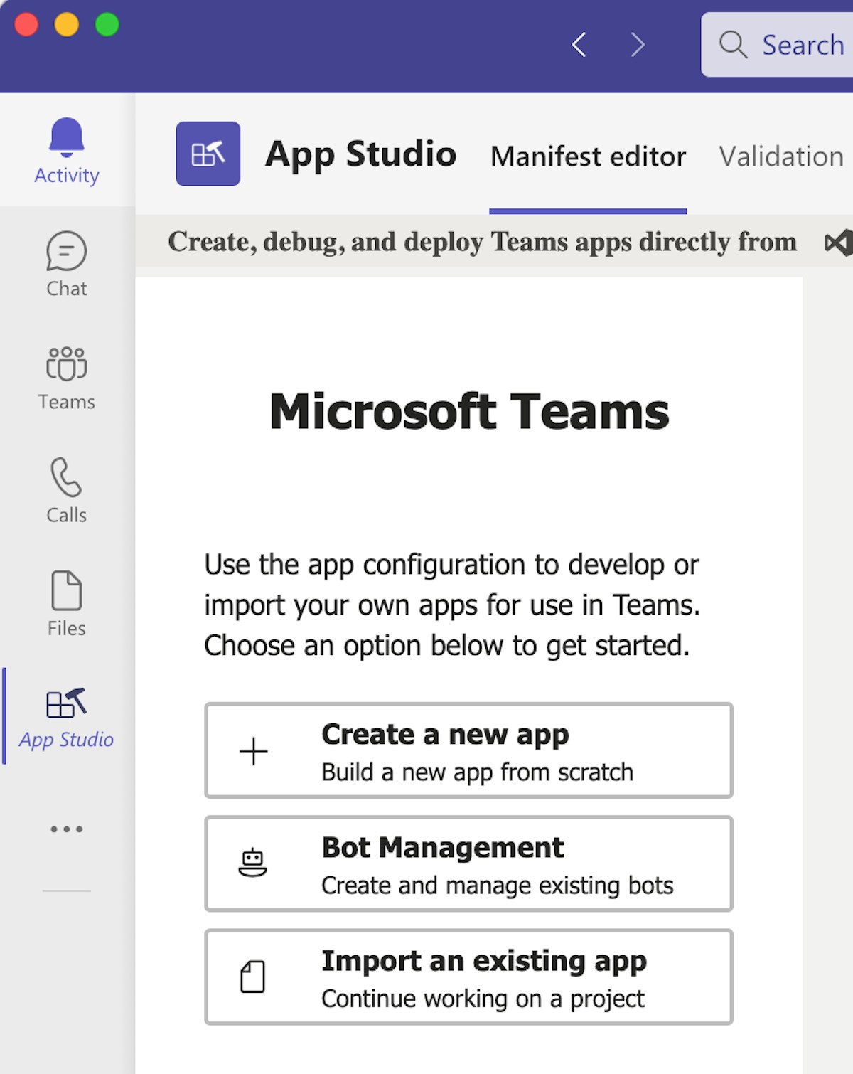 Once App Studio is installed, we will create a new bot within Microsoft Teams. Use the sidebar of Microsoft Teams to navigate to App Studio —> Manifest editor —> click "Bot management."