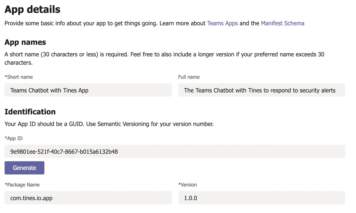 2. Enter a short name, full name, generate an App ID and fill in the Package Name (com.tines.io.app) and Version Number (1.0.0). Note down the App ID somewhere safe for easy future reference.
