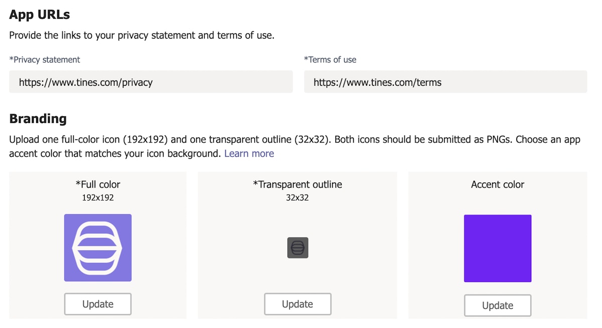 4. Enter the privacy statement, terms of use, and required branding information for your app.