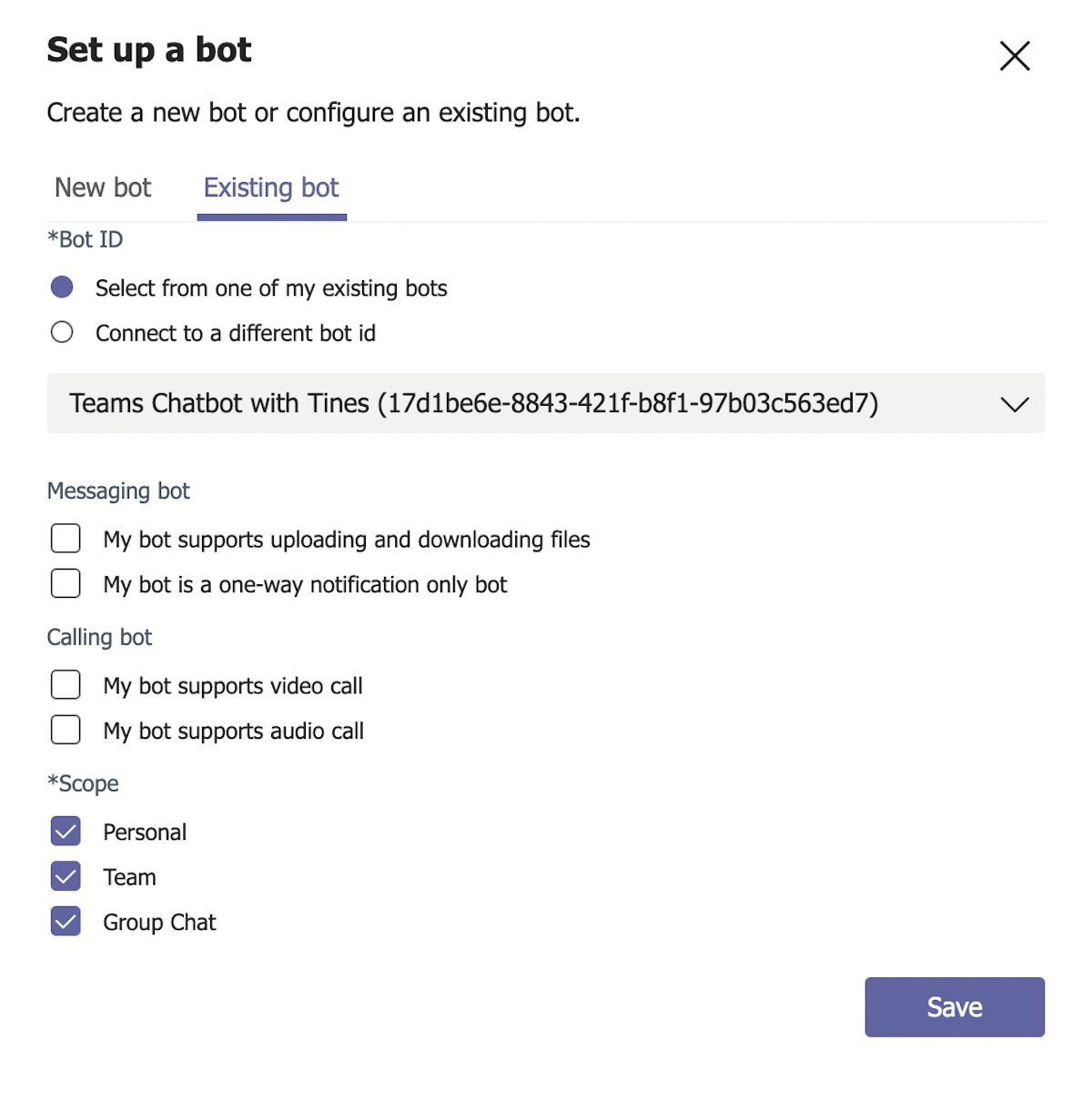 6. Choose "Existing bot" along the top and "Select from one of my existing bots." For Scope, enable all three available scopes (Personal, Team, Group Chat) and click "Save." This step links the bot we created with the new app.