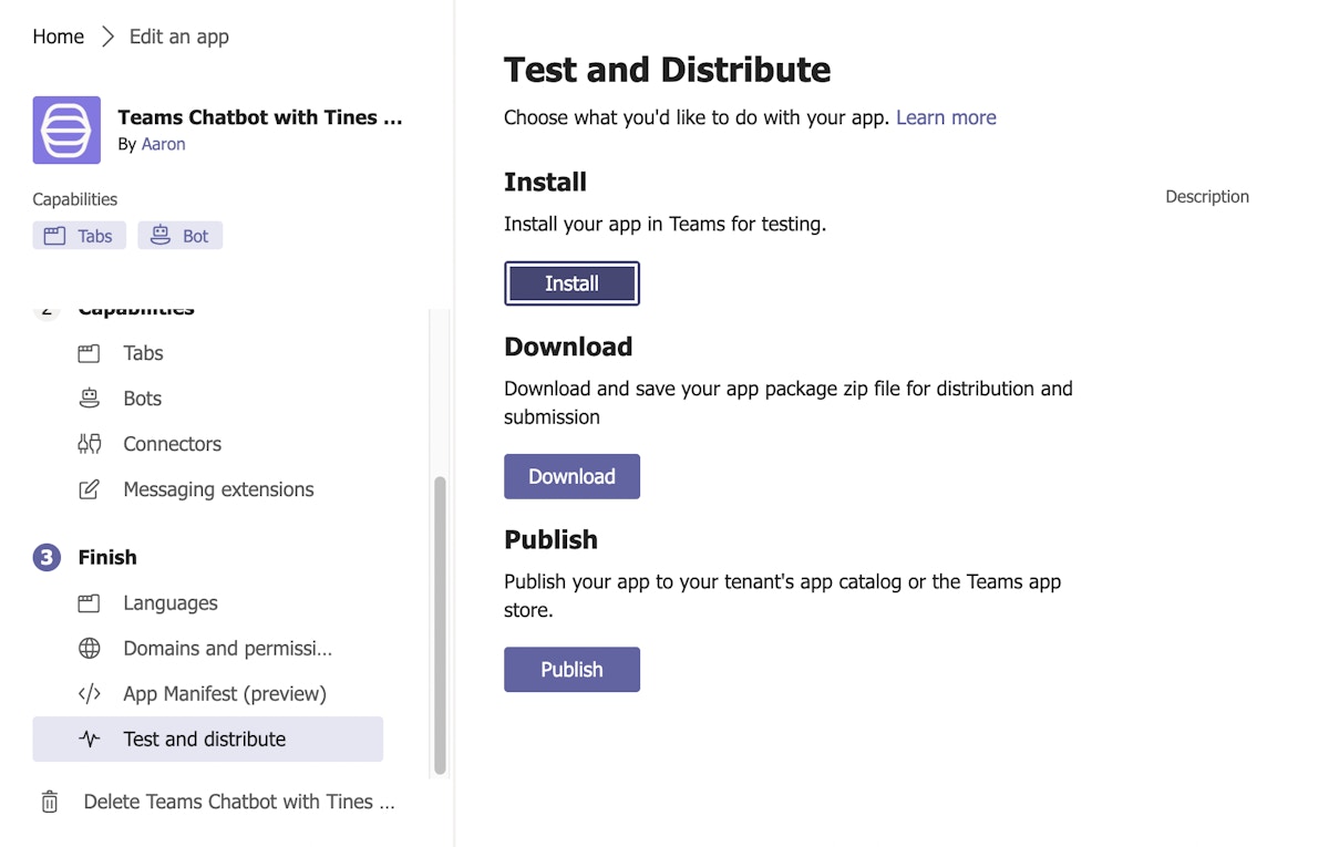 7. Navigate to Finish —> Test and distribute —> and click "Install."