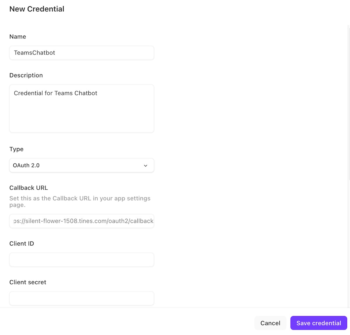 a) Name: Any name that describes the credential (e.g., TeamsChatbot is used in the Story attached and can be leveraged for consistency)