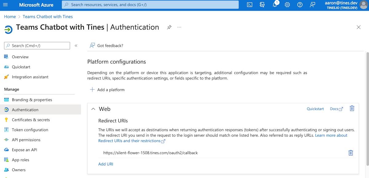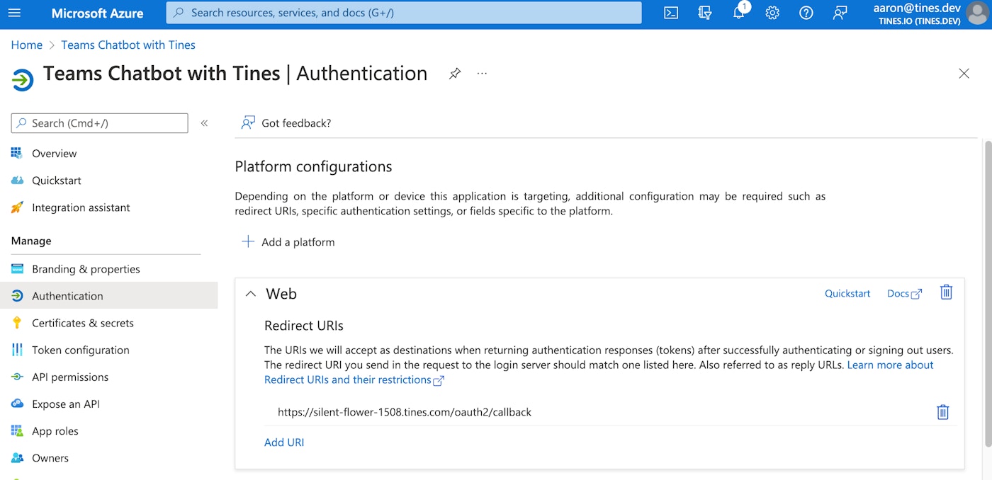 8. You should see the Redirect URI populate in the middle of the screen under the "Add a platform" button.